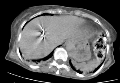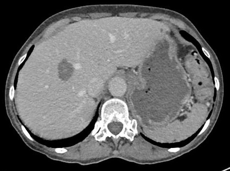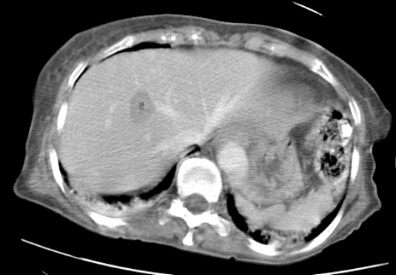 This is a CT image obtained 1 month after microwave ablation demonstrating the lack of enhancement in the treated area in the liver.