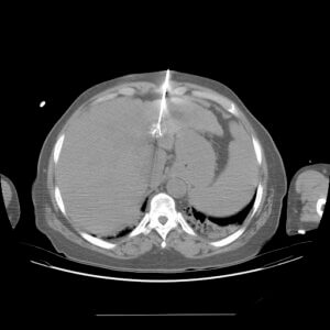 This is a CT image obtained during a microwave ablation case demonstrating the antenna within the target tumor.