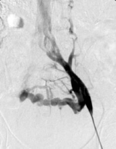This image is from a venogram of the pelvis. It demonstrates narrowing of the left common iliac vein due to May-Thurner Syndrome with collateral vessels crossing the pelvis.