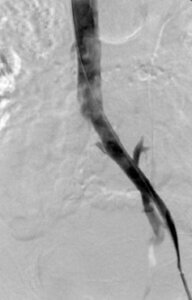 Chronically narrowed or occluded veins can be opened using a combination of techniques. These procedures are performed in the hospital under sedation. During this procedure, a catheter is placed into a leg vein. Using x-rays as our guide, we can pass this catheter through the narrowed or blocked vein, and begin the process of opening the vein. Sometimes, a balloon will be placed in the vein and inflated, to stretch open the narrowed vein. Often, we will place a small metal stent in the vein to hold it open.