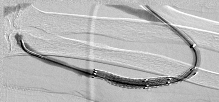 Comment: Repeated punctures into an arteriovenous graft can potentially lead to pseudoaneurysm formation. In some cases, bleeding through the skin can result. When this occurs, options for treatment include revising the graft or placement of a covered stent in the affected limb of the graft. This is what was done in this case. Two stents were placed across the pseudoaneurysm to insure that they were adequately anchored in the graft both proximal and distal to the pseudoaneurysm. Once they were deployed and post-dilated, the pseudoaneurysm was effectively excluded.