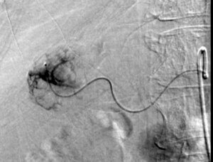 The mapping angiogram confirmed the presence of tumor hypervascularity arising from a small branch of the right hepatic artery.