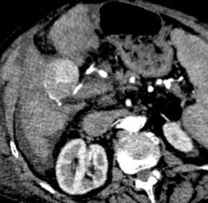 The pre-procedure CTA demonstrated a single hyper vascular mass within segment 4 supplied by an apparent single feeding branch of the right hepatic artery.