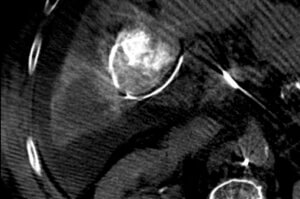 A cone-beam CT was performed during the mapping angiogram to better characterize the vascular anatomy of the tumor and identify any non-target enhancement of normal liver. A single feeding artery to the tumor was confirmed. This artery did not contribute blood supply to normal liver. On the treatment day, the tumor was treated via superselective administration of y-90 glass microspheres in a radiation segmentectomy approach.