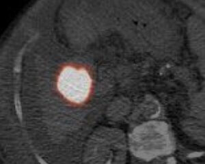 Following y-90 administration, the patient was transferred to the PET scanner for a post-infusion PET-CT, which confirmed complete tumor coverage.