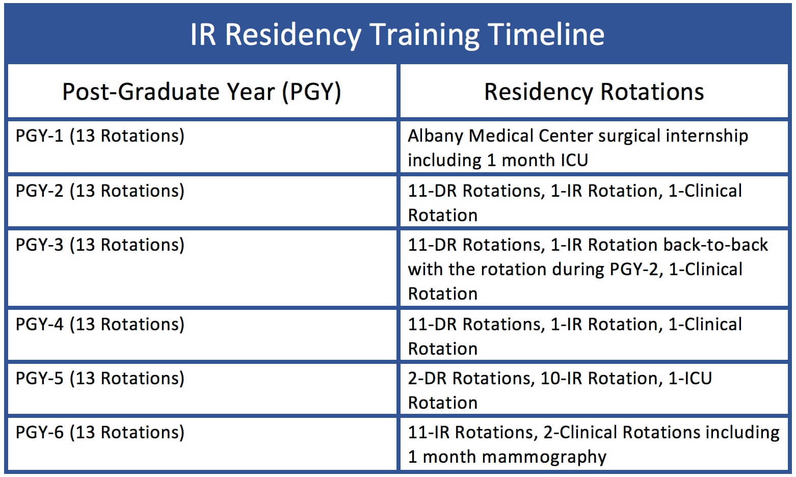 In 2016, we were very proud to earn accreditation for an integrated IR residency at Albany Medical Center. We matched our first resident in March 2017. Click here to learn more about our IR residents. Trainees in this program will spend 6 years with us, including a surgical internship year (PGY-1), three years of diagnostic radiology (PGY-2, PGY-3, and PGY-4), and two years of interventional radiology training (PGY-5 and PGY-6). Moving forward, we will be offering 1 position/year in the IR residency. Please see the chart below outlining the residency training timeline.