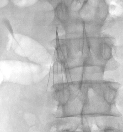 The IVC filter placement procedure first involves placing a small catheter tube into a patient’s vein. We most commonly access the right or left common femoral vein in the groin or the right internal jugular vein in the neck to place a filter. However, other veins such as a small vein of the arm or the popliteal vein behind the knee can be used for filter placement as well. Once a small catheter is placed into the vein, it is directed into the Inferior Vena Cava (IVC). Contrast, or x-ray dye, is injected into this catheter, and images of the Inferior Vena Cava are obtained. These images allow us to determine the size of the IVC, whether clot is present within the IVC, whether the IVC is normal in appearance or if there is a congenital variation present which may impact filter placement, and where the renal veins enter the IVC (since that determines where the filter is placed within the IVC). Once all of this information has been obtained, we proceed to filter placement. This simply involves placing the filter, which is attached to a wire, into the catheter and positioning it appropriately within the IVC. Once the filter is where it needs to be, it is released from the wire and deployed in the vein.