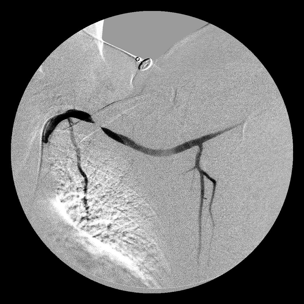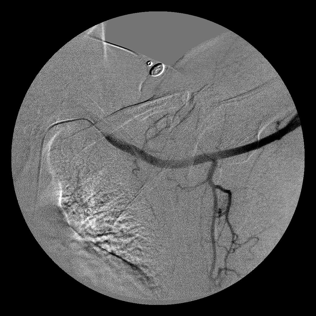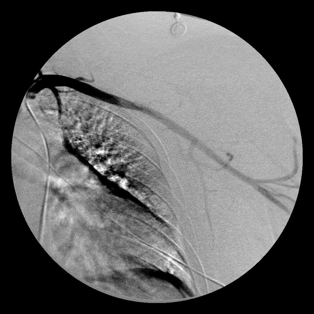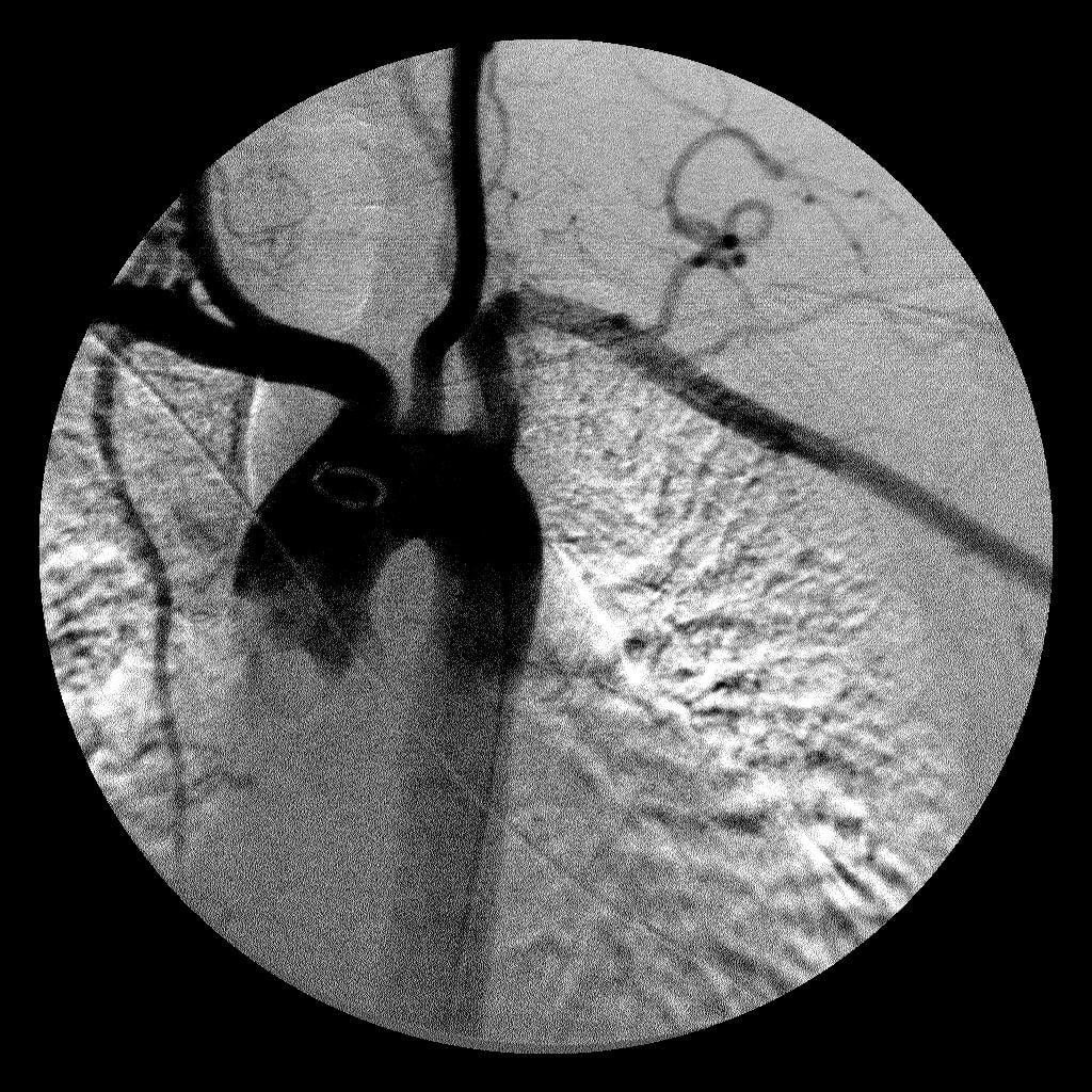 Comment: This patient only experienced symptoms when he was upright and his arm was positioned over his head. As a result, this angiogram was performed with the patient in an upright position on a tilt table. Once the catheter was in place within the left subclavian artery, the arm position was changed until the radial pulse was no longer palpated. At this point, the angiogram was performed, demonstrated the left subclavian artery stenosis.