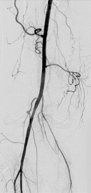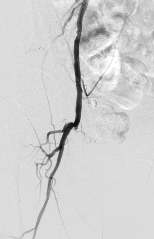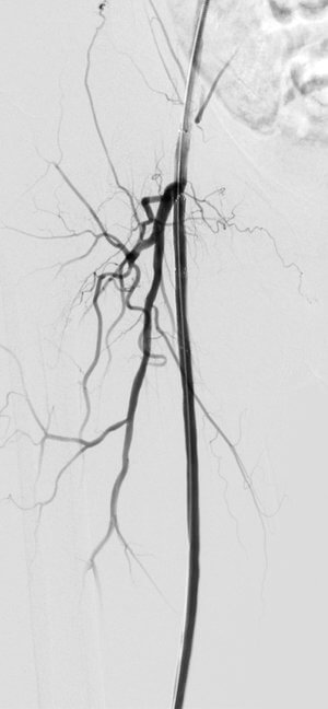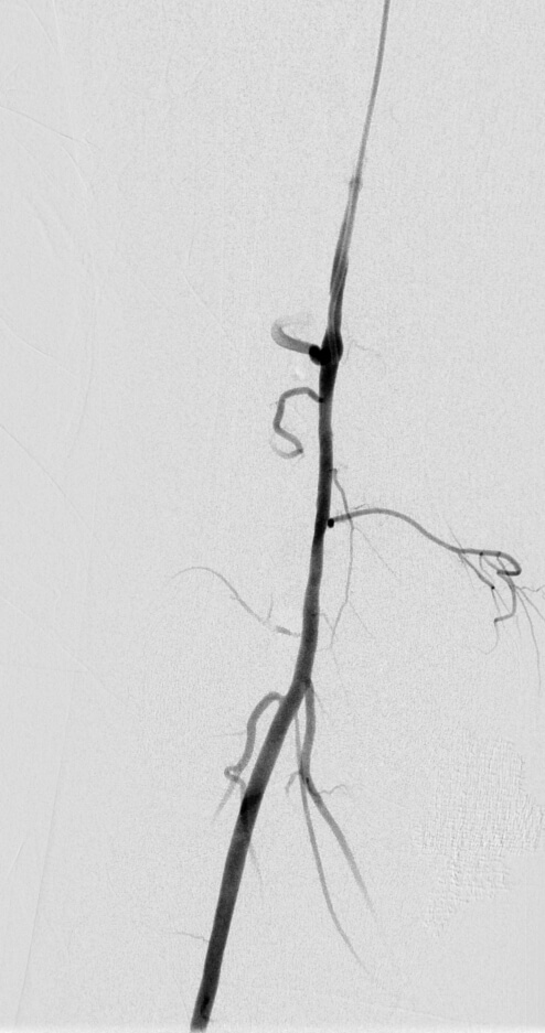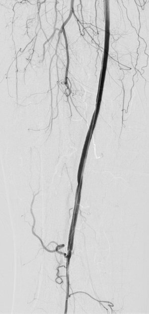 This image demonstrates restored patency after stent placement in the SFA and above-knee popliteal artery.