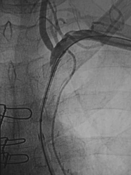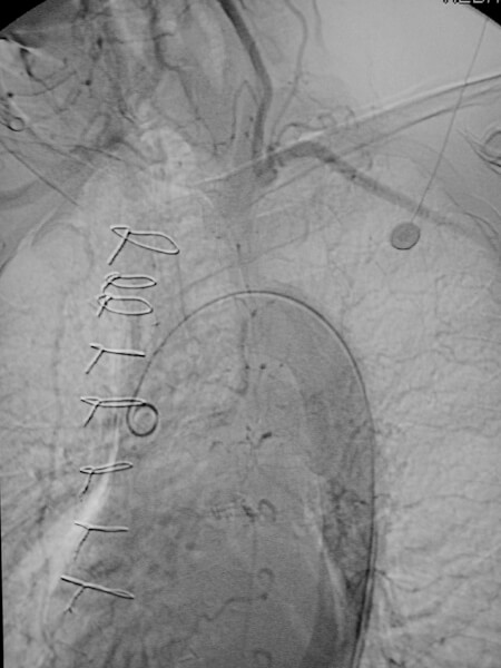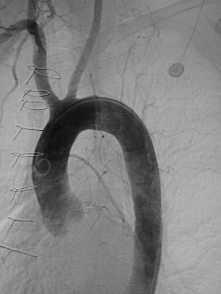 Early image from a thoracic aortogram demonstrating occlusion of the left subclavian artery. -