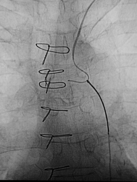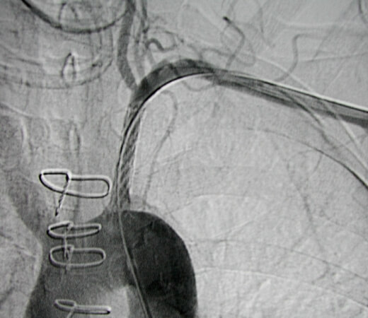 Comment: Given the left subclavian artery occlusion at the origin with almost none of the occluded vessel evident on the thoracic aortogram, it was best to gain upper extremity arterial access to facilitate the attempt at crossing the occlusion. Once we were able to cross the occlusion, we didn’t want to place the sheath needed for stent placement. Therefore, we used a snare to capture the guidewire and ultimately placed a balloon-expandable stent across the occlusion from a common femoral artery approach.