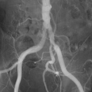 This image is from an angiogram of the abdomen and lower extremities after the placement of stents at the origins of the common iliac arteries. As a result of stent placement, more blood flow can now pass through these vessels to the legs, which can help ease symptoms.