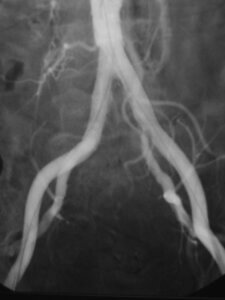 This image is from an angiogram of the abdomen and lower extremities. It demonstrates the aorta at the top of the image dividing into the common iliac arteries which bring blood to the legs. Stenoses (or areas of narrowing) are present at the origins of both of the common iliac arteries.