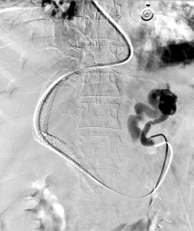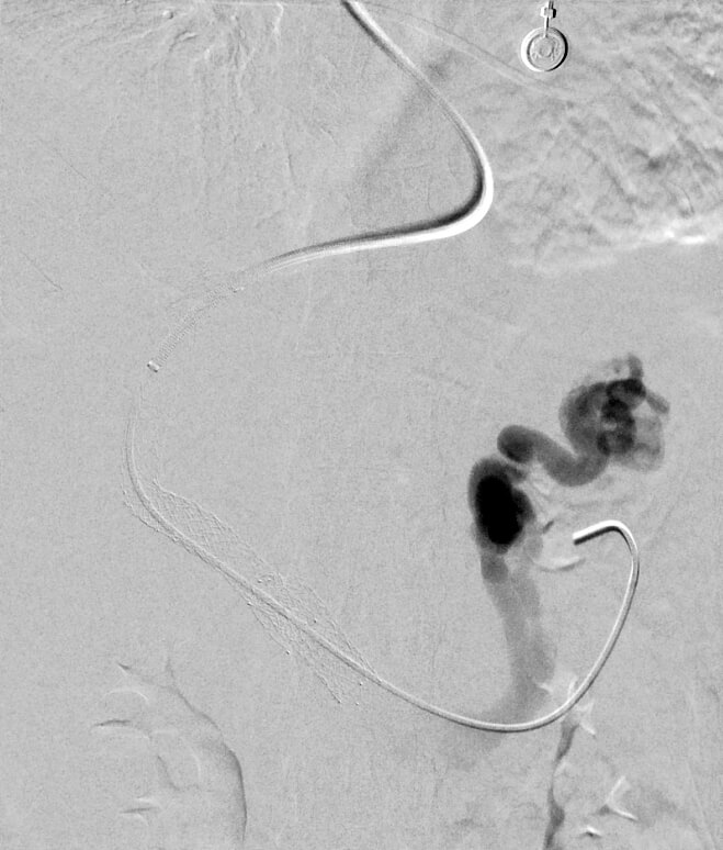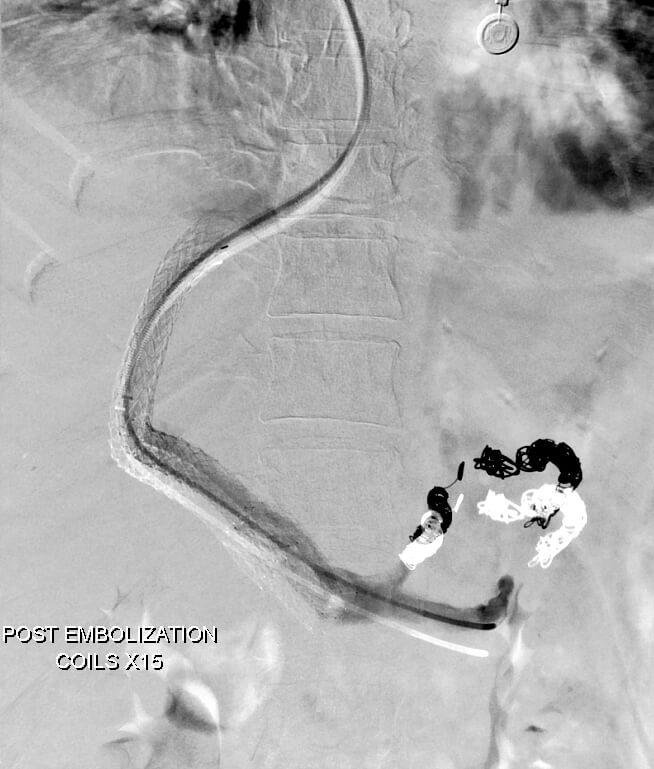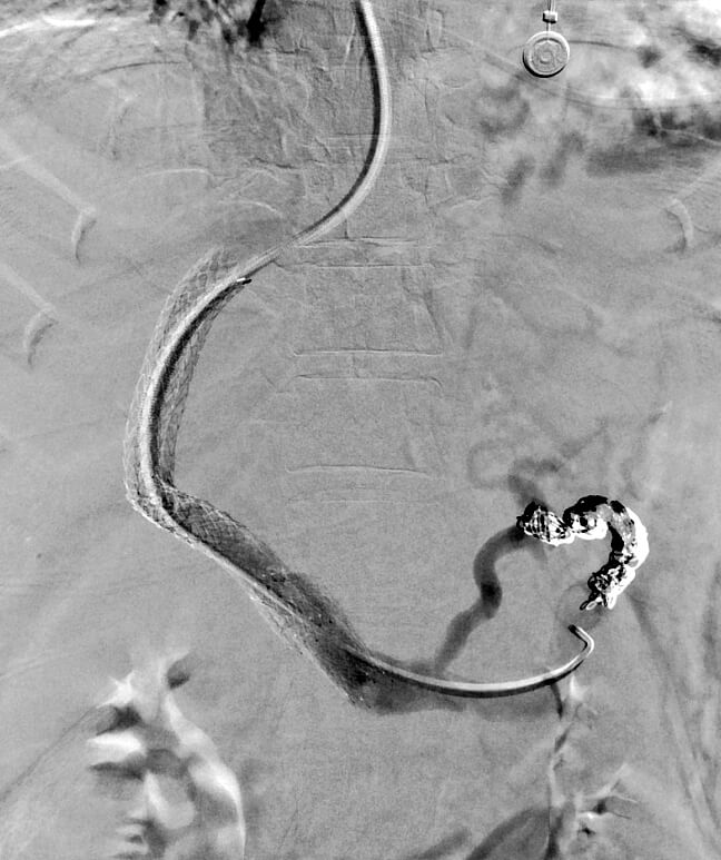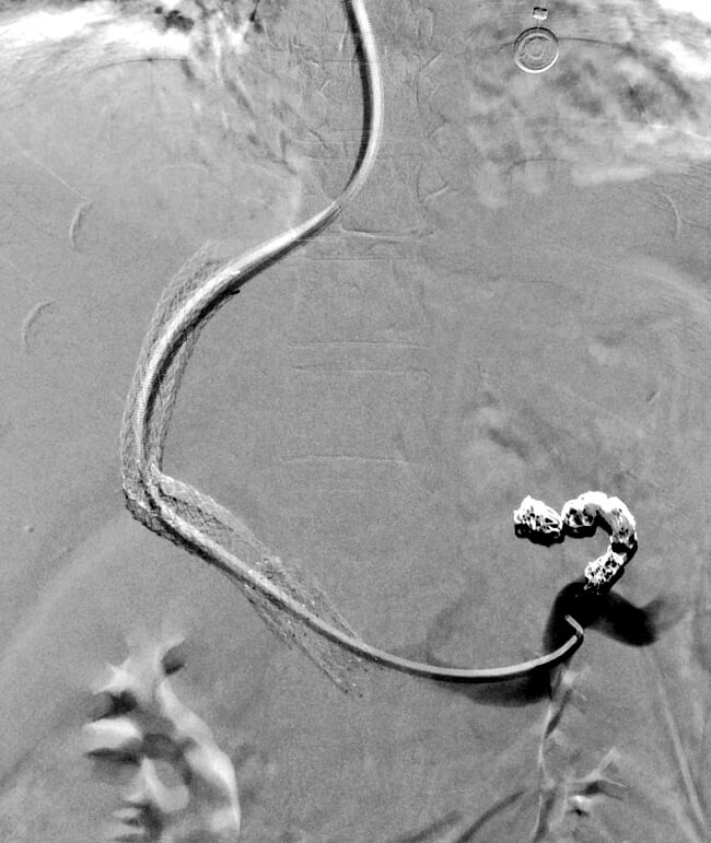 Comment: Once a TIPS procedure has been performed, it is our hope that the portosystemic pressure gradient would be <12 mm Hg. At times, esophageal varices remain visible on venography, despite a therapeutic pressure gradient. When this occurs in a patient who presented initially with variceal bleeding, we try and embolize those varices to further reduce the risk of future bleeding.
