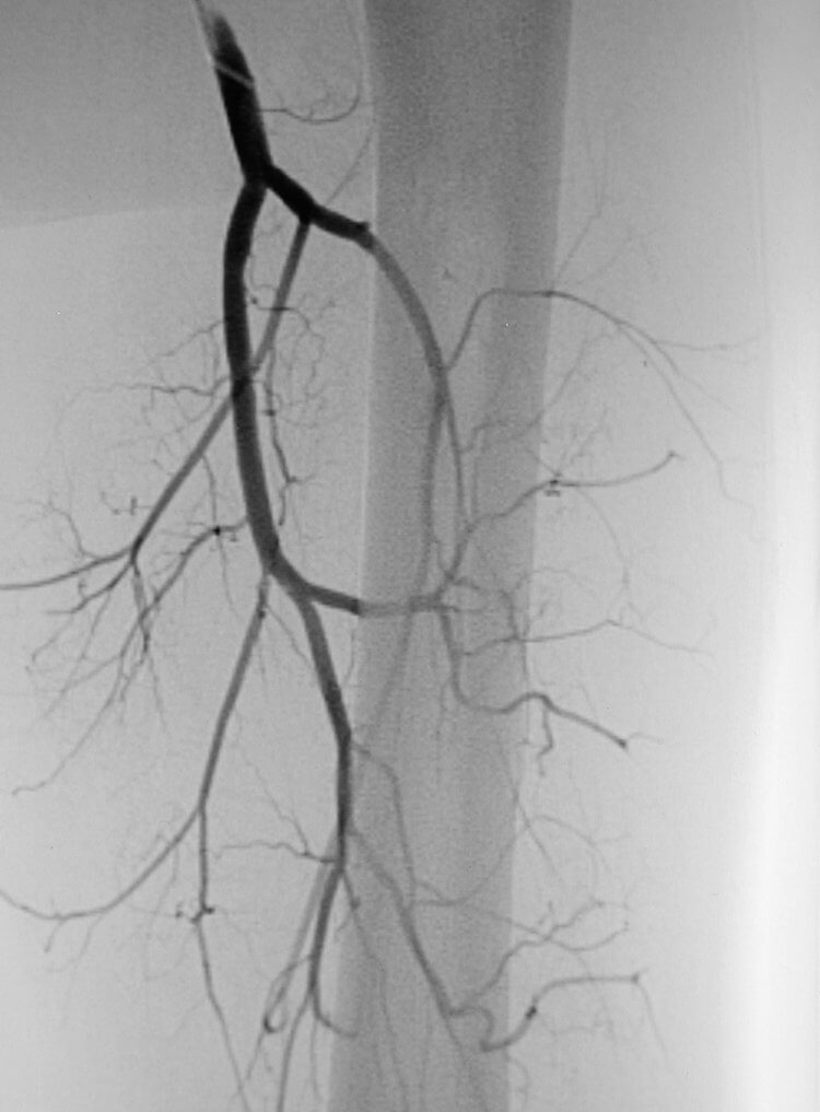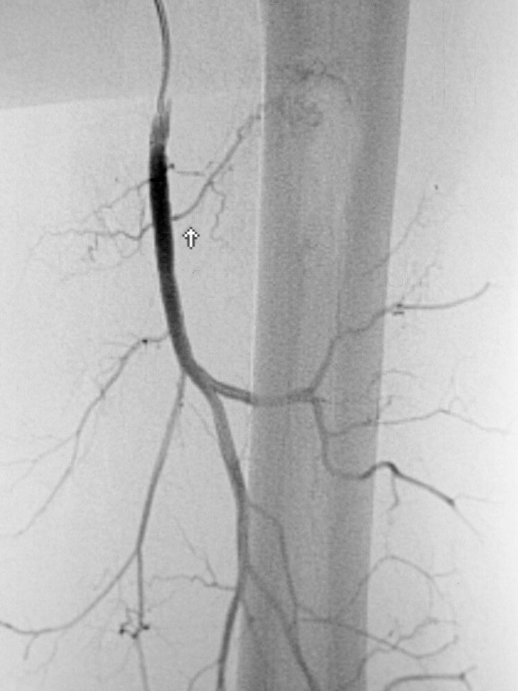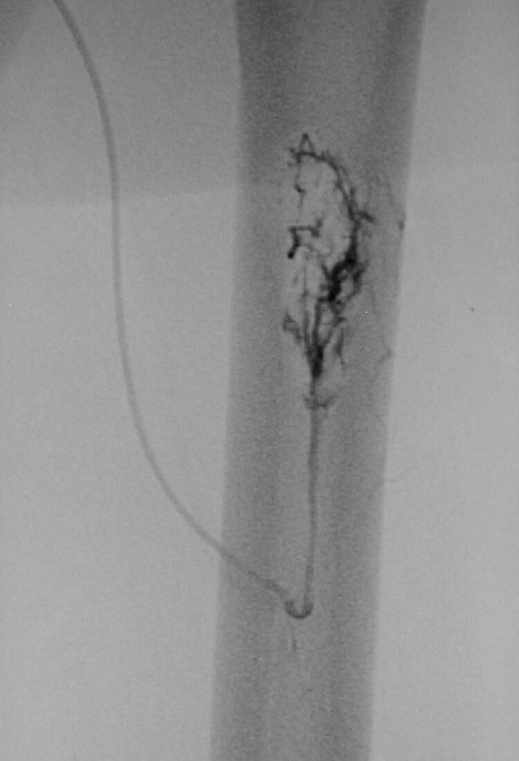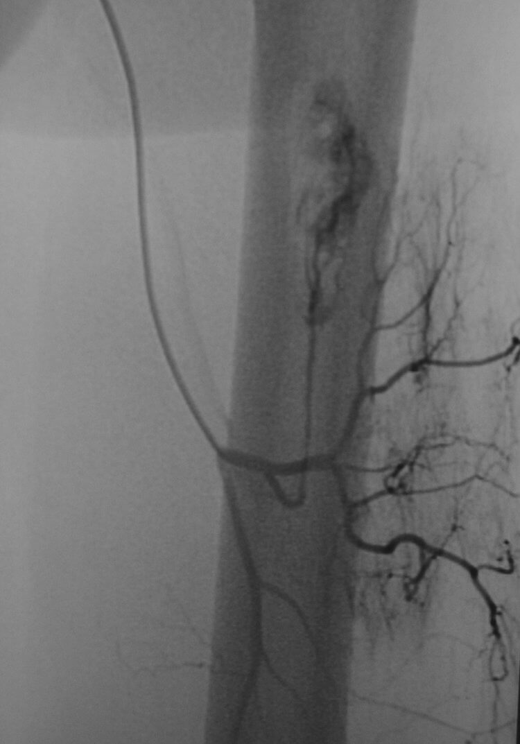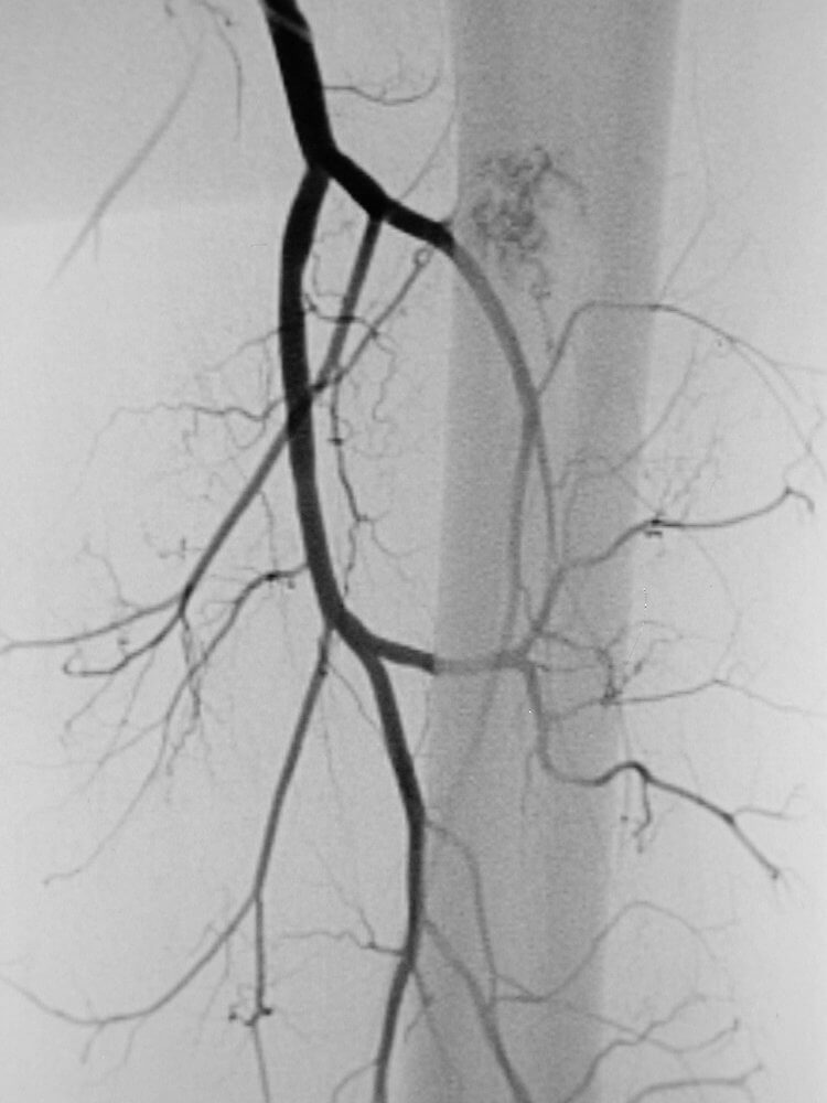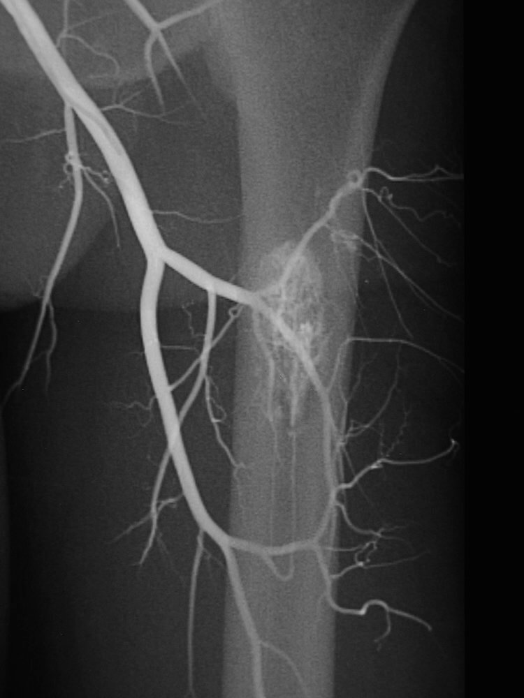 67 year old female patient with renal cell carcinoma who presents with a metastasis to the left femur for preoperative embolization.