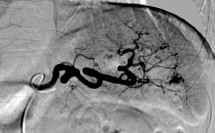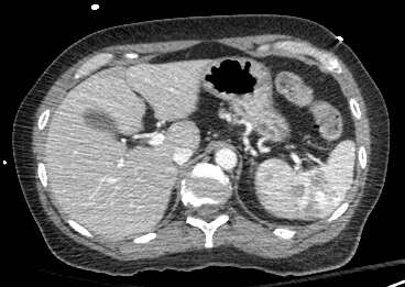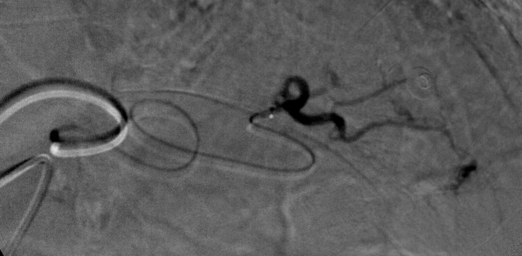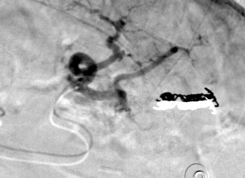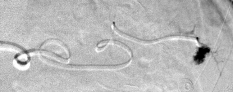 Comment: This, like case #3, is another example of a splenic laceration with active extravasation. Once again, we tried and were able to selectively catheterize the injured artery, enabling performance of a distal embolization.