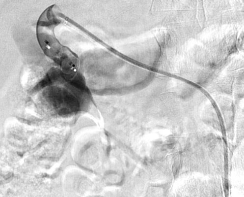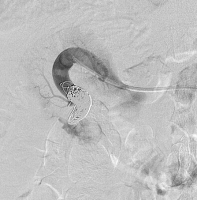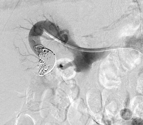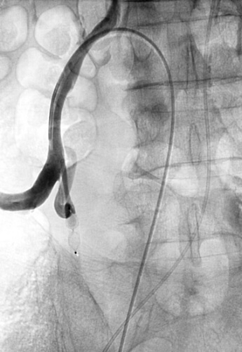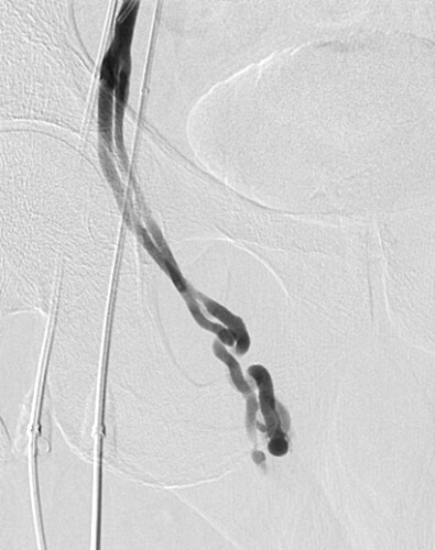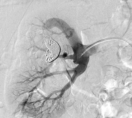 Comment: This patient presented with scrotal pain, right flank pain, and early CHF. Upon review of the imaging, it became clear that all three of these symptoms were related. The renal angiogram demonstrated prompt opacification of the right renal vein and IVC. This appeared to be secondary to an AV fistula that resulted in increased venous pressure, which contributed to the development of a varicocele (through a branch of the right renal vein draining into the right testicular vein before passing into the IVC). In addition, the outflow from the fistula likely increased right heart pressure, leading to his cardiac symptoms.