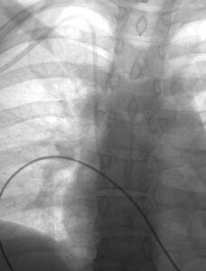 The placement of a tunneled catheter is done under sedation and with local anesthesia to ensure that the patients are comfortable throughout the procedure. The procedure begins with gaining access into a suitable vein in the body. The vein that is used is typically a larger vein either in the neck (internal jugular vein) or the chest (subclavian vein). At times, we may use a vein in the arm or the leg based on a patient’s individual circumstances. Once a small needle is placed into that vein, a guidewire is advanced further into the vein to maintain position within the vein. At this point, we direct our attention to the site on the chest where the catheter will be exiting. A small incision is made at that site, and the catheter is advanced through that incision to the vein access site. The catheter is then advanced into the vein and positioned with its tip right near the heart. We determine the exact position of the catheter tubing using x-rays. Once the catheter is appropriately positioned, we place some stitches to help hold the catheter to the skin. Over time, there is a cuff on the catheter that is able to attach itself to the tissue under the skin, which helps keep it in place for a longer period of time. Following the procedure, you will spend 1-2 hours in our recovery area.