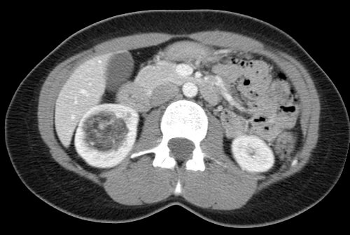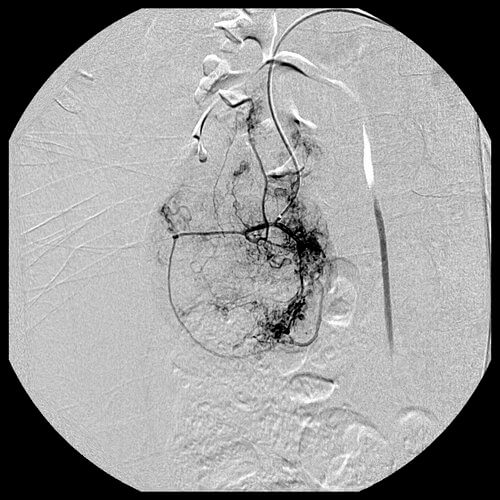Comment: This case demonstrates the classic appearance of an angiomyolipoma on CT and the hypervascularity associated with this benign tumor. The clearly seen abnormal vasculature enabled selective catheterization of the dominant supply to the angiomyolipoma and subsequent selective embolization with PVA particles. Embolization can be performed successfully with several types of particulate and/or liquid embolic agents. In this case, PVA was used successfully and no growth or viability has been seen on follow-up imaging after this procedure.